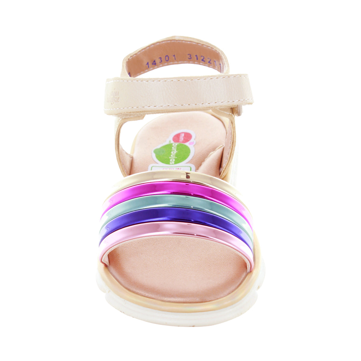 ¡Disfruta del verano con estilo con estas fabulosas sandalias de temporada! En un hermoso color maquillaje que combina con cualquier outfit, estas sandalias tienen un ajuste en velcro para un ajuste perfecto en tus pies. La suela bicolor presenta un impresionante efecto tornasol dorado que seguramente captará la atención donde quiera que vayas. Además, la banda en el empeine en charol metálico dorado, magenta, menta, azul y cobre añade un toque de glamour a los pasos de tu niña.